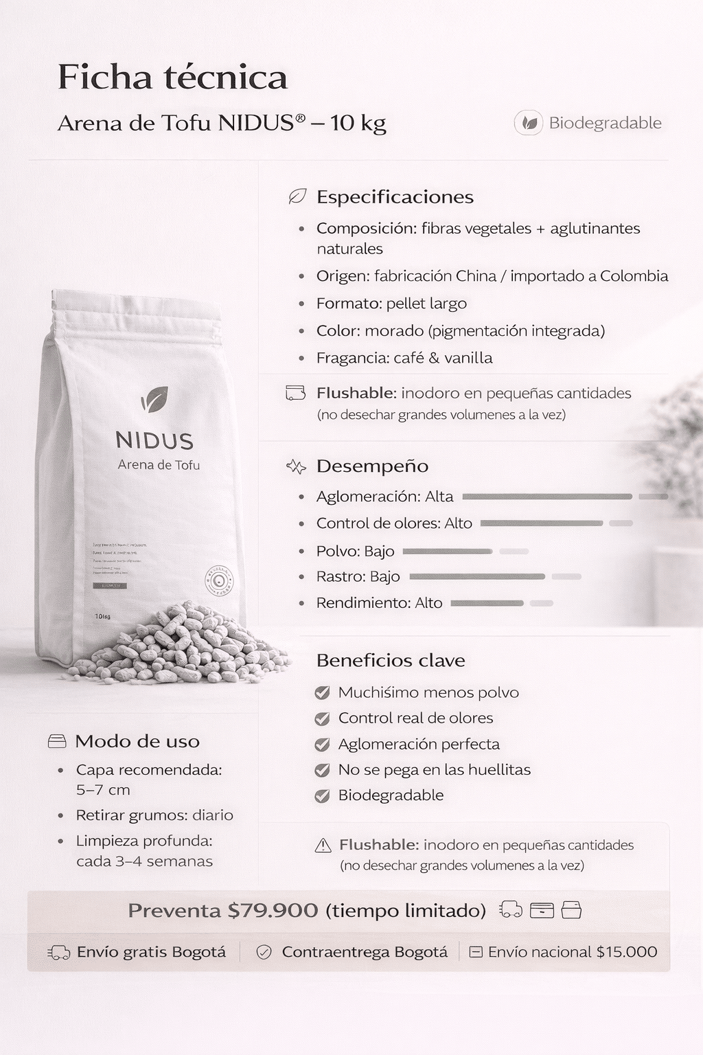 Una bolsa de 10 kg rinde hasta 3 semanas para 2 gatos en un solo arenero, controlando eficazmente los olores, formando grumos firmes y generando mínimo polvo. No se pega en las patas, evitando el rastro de arena por la casa. Es biodegradable y segura para el uso diario.