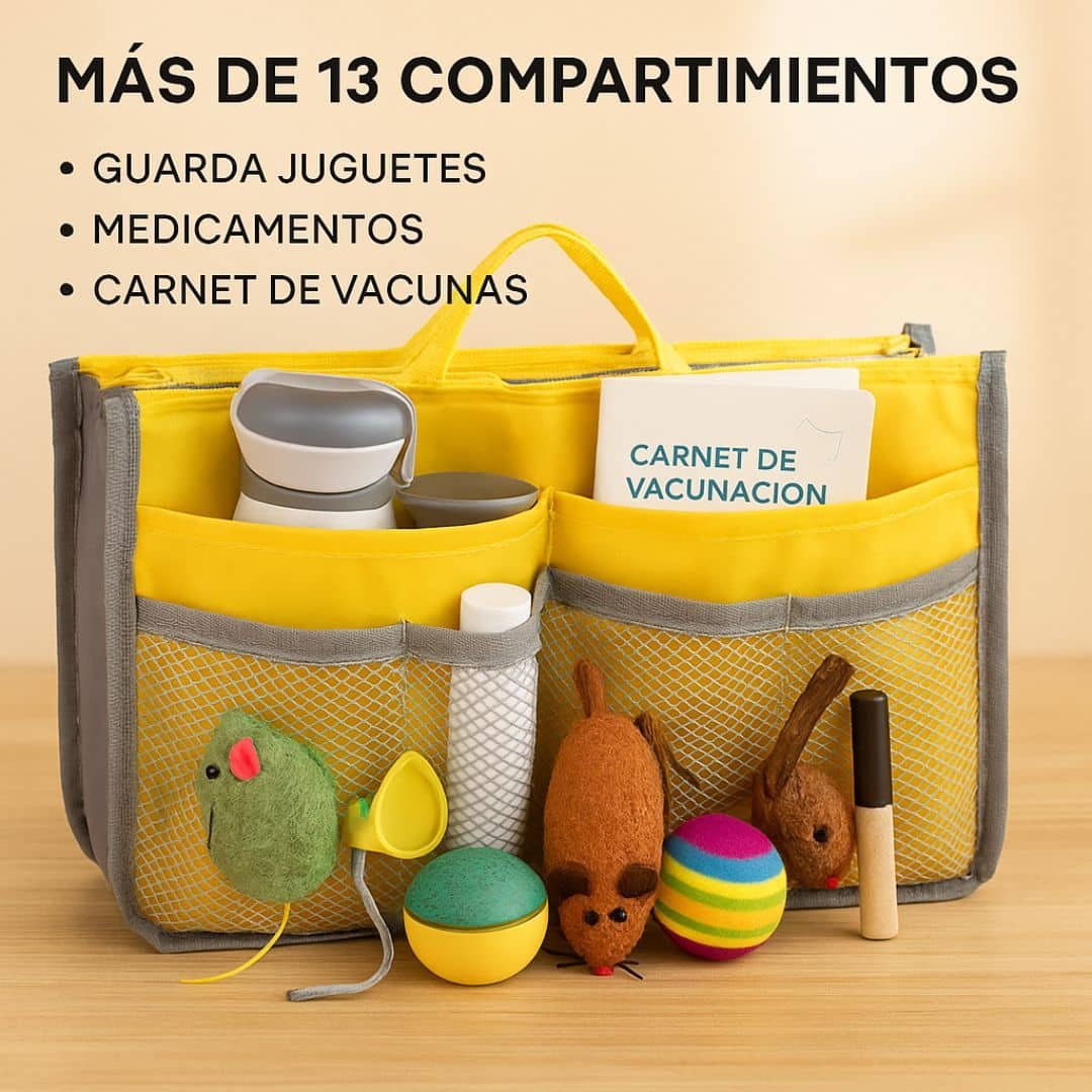 Organizador multiusos (13 compartimentos) – guarda juguetes, snacks, medicamentos y hasta el carnet de vacunas.